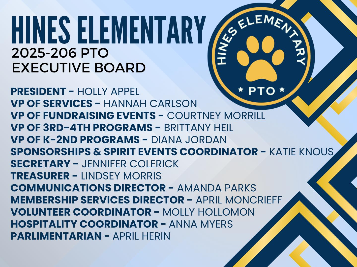 | Treasurer | Lindsey Morris | hinesptotreasurer@gmail.com |
